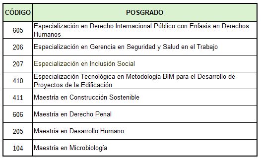 Se recomienda indicar al cajero, el código del programa académico (ver tabla) y en el caso que se requiera, relacionar el número de cuenta corriente N° 110031060015.