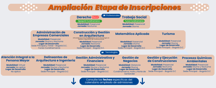Postúlate al programa de Derecho en la Sede Zipaquirá y a las Tecnologías en Gestión de Negocios - modalidad distancia (todas las sedes) y Atención Integral a la Persona Mayor - modalidad virtual. Consulta aquí las fechas del proceso de admisión.