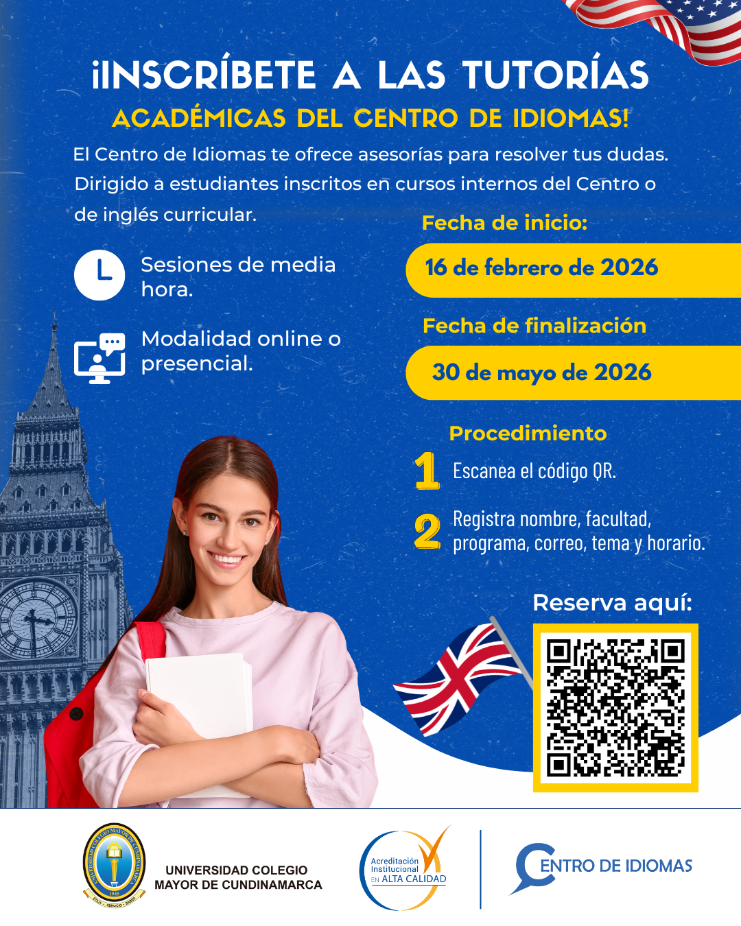 En caso de no poder asistir, agradecemos cancelar su reserva por medio del correo centroidiomas@universidadmayor.edu.co con 2 horas de anticipación a la tutoría.